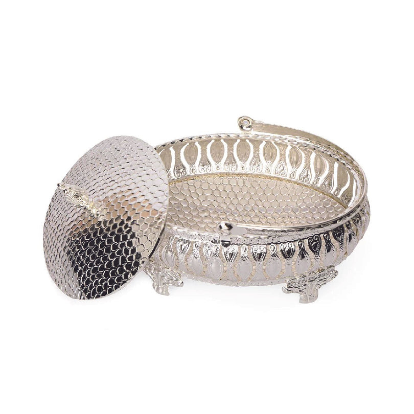 The Round Dry Fruit/Mukhvas Basket is a stylish and functional serving accessory, perfect for presenting dry fruits or mouth fresheners elegantly. Its round design, often crafted from metal or decorated with intricate patterns, adds a touch of sophistication to festive occasions and gatherings.