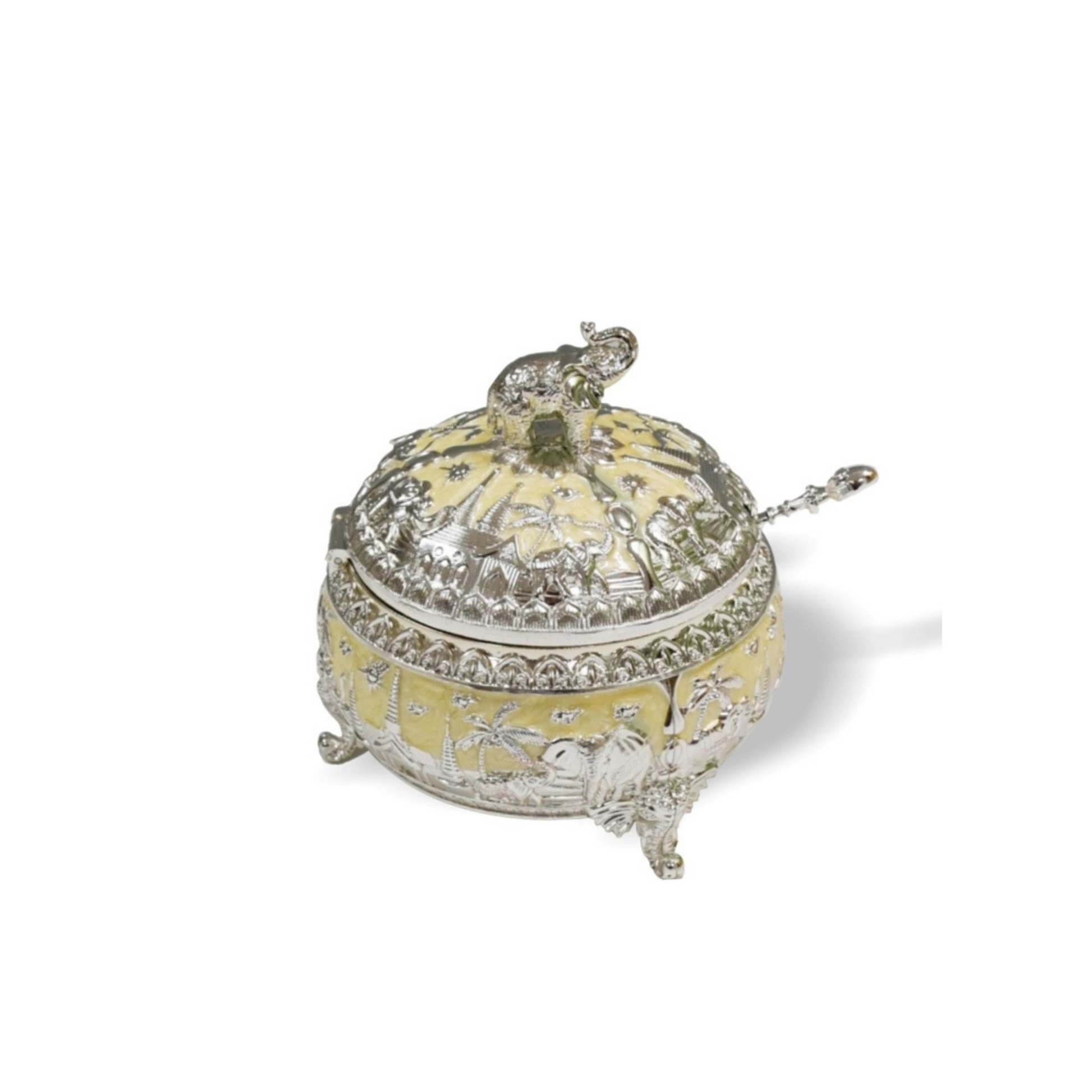 A charming elephant-shaped candy pot in a soft cream hue, perfect for storing candies or treats. Its whimsical design and vibrant color make it a delightful addition to any home or festive setting.