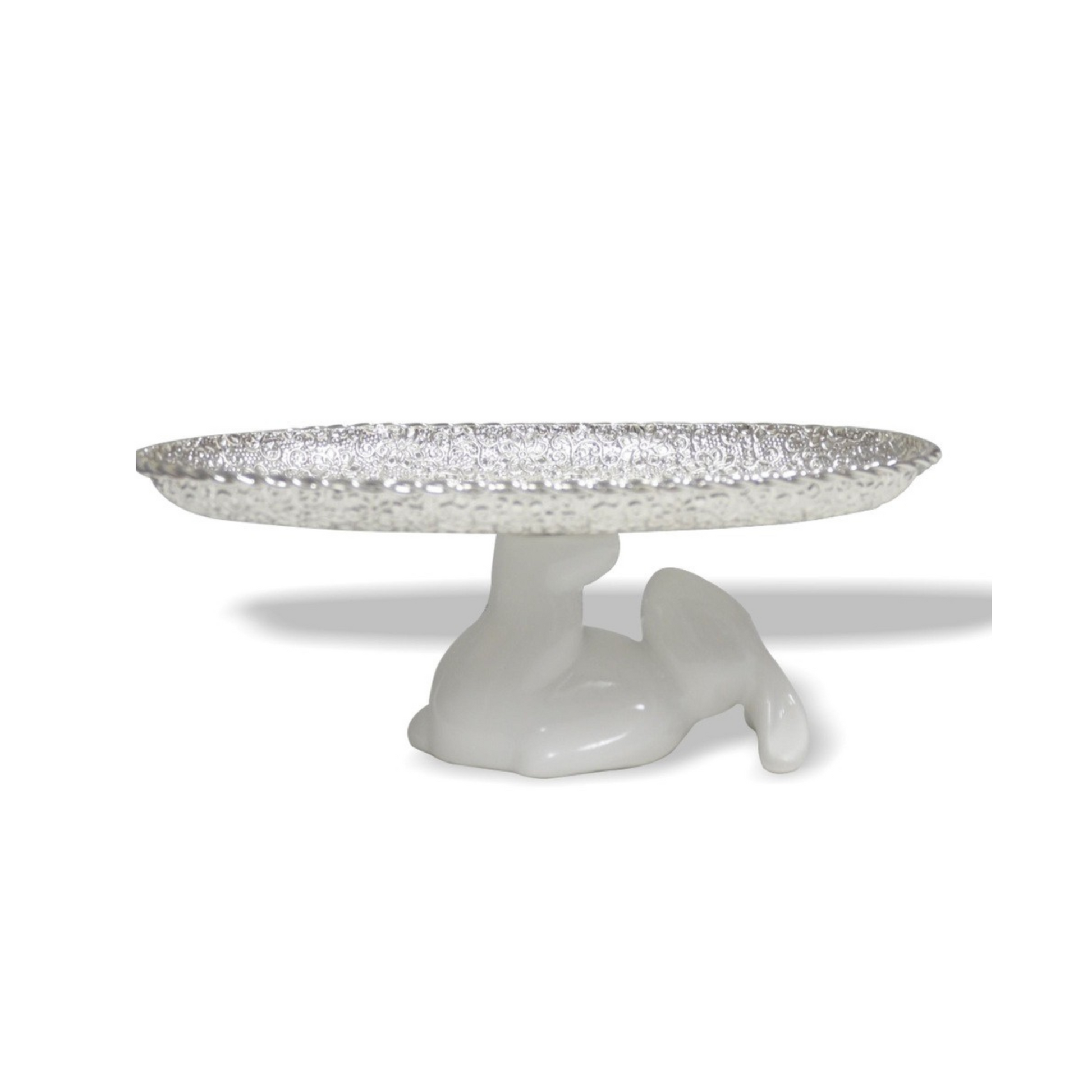A charming German silver and ceramic cake stand featuring a playful rabbit design, perfect for displaying cakes or desserts. Its whimsical yet elegant style makes it a delightful addition to any occasion or table setting.