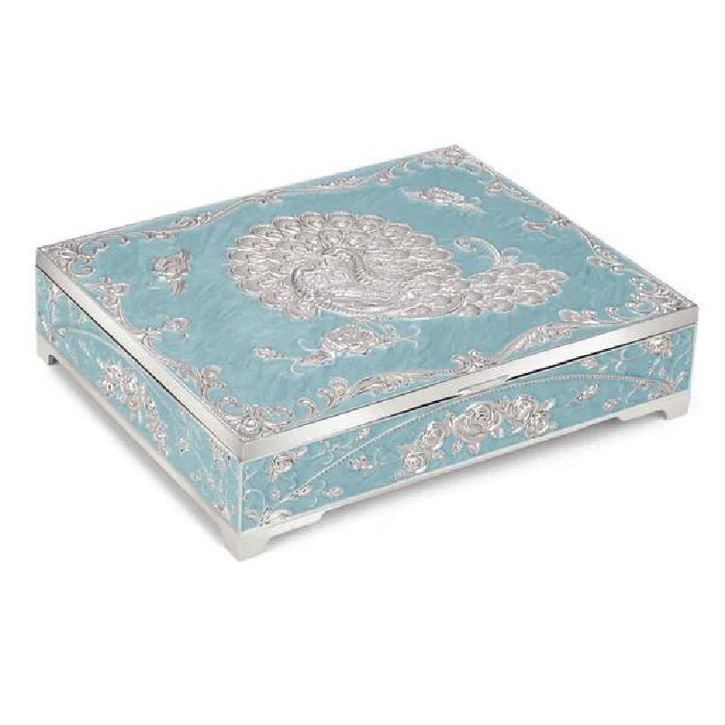 A blue enamel jewelry box features a smooth, glossy finish with vibrant hues, often adorned with intricate designs or metallic accents. Its interior is typically lined with soft fabric to protect jewelry.