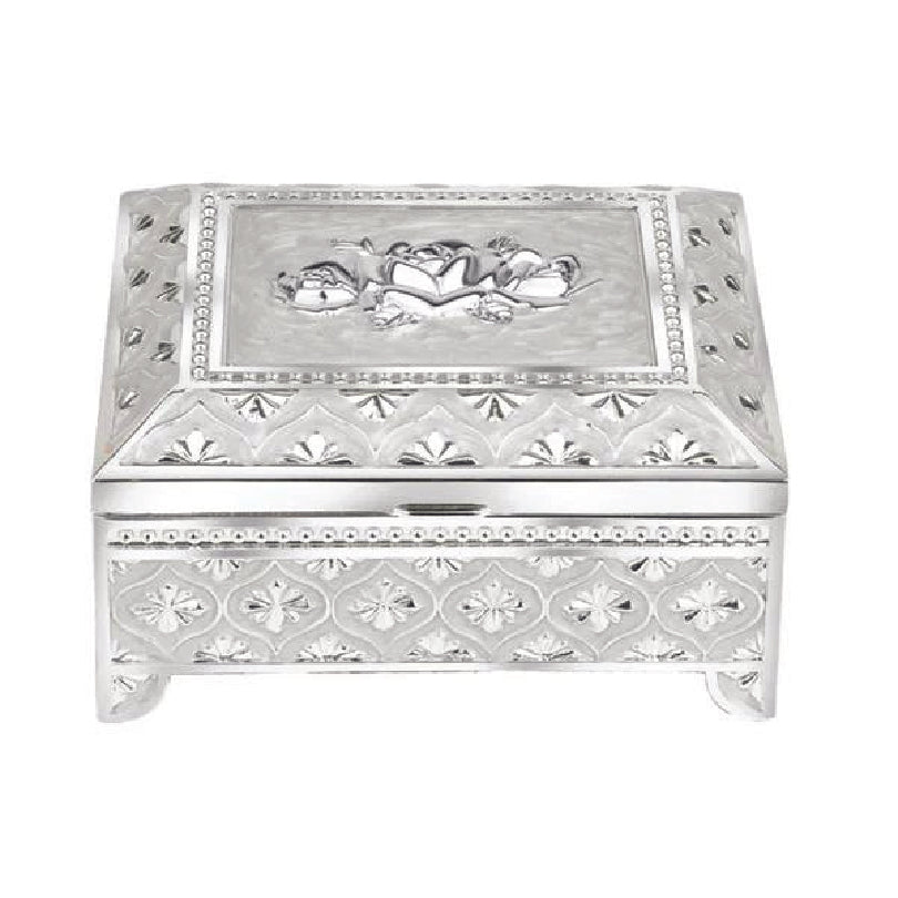 This elegant white enamel jewelry box features intricate gold and silver floral designs, a glossy finish, and a decorative flower-shaped latch, perfect for safeguarding your precious keepsakes.