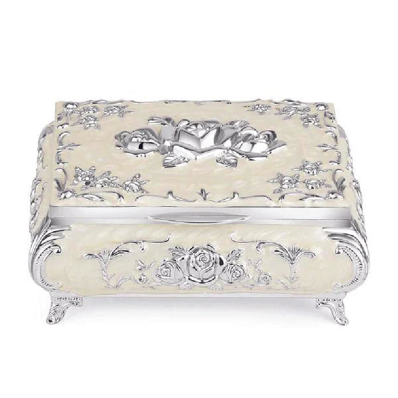 A white enamel jewelry box has a sleek, glossy finish with a clean, elegant appearance. It may feature delicate designs or accents, often in gold or silver, with a soft, protective interior to safely store jewelry.