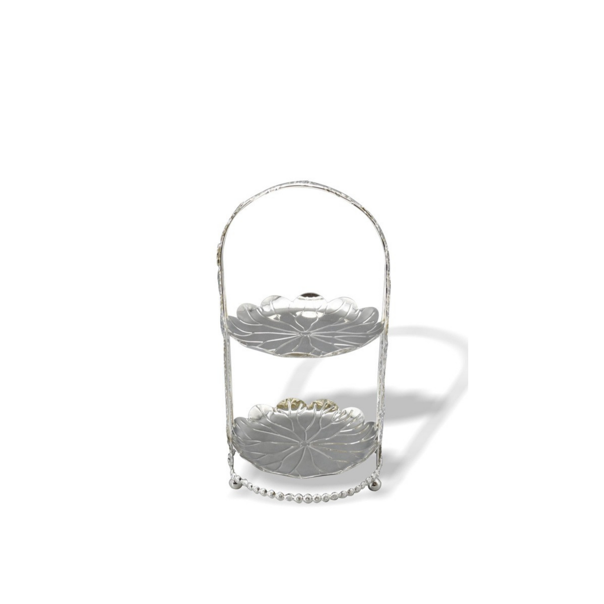 A charming 2-tier flower basket with a round base and an elegant handle, perfect for showcasing flowers or serving treats. Its sturdy design and intricate detailing make it a versatile decorative piece.