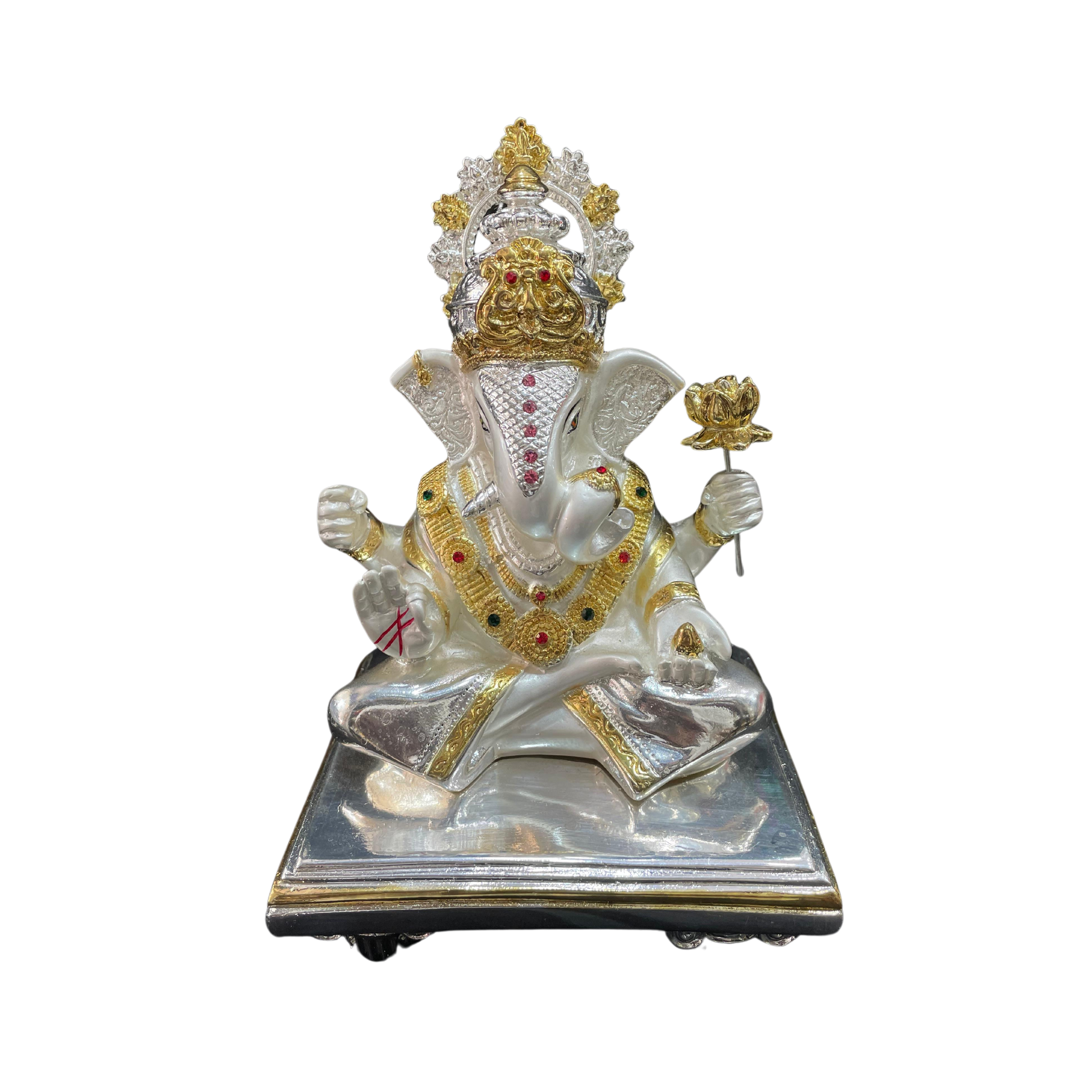The Silver and Gold Plated Ganesh Idol features intricate detailing of Lord Ganesha, crafted with a stunning blend of silver and gold. This divine figurine is perfect for worship, bringing blessings of wisdom, prosperity, and removal of obstacles to your home or temple.