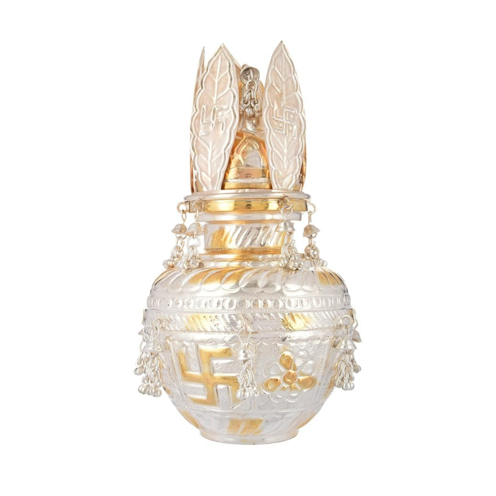 The Silver and Golden Plated Kalash is a beautifully designed sacred vessel, symbolizing prosperity and abundance. With its gleaming silver and gold finish, it serves as an essential item for religious rituals and home decor.