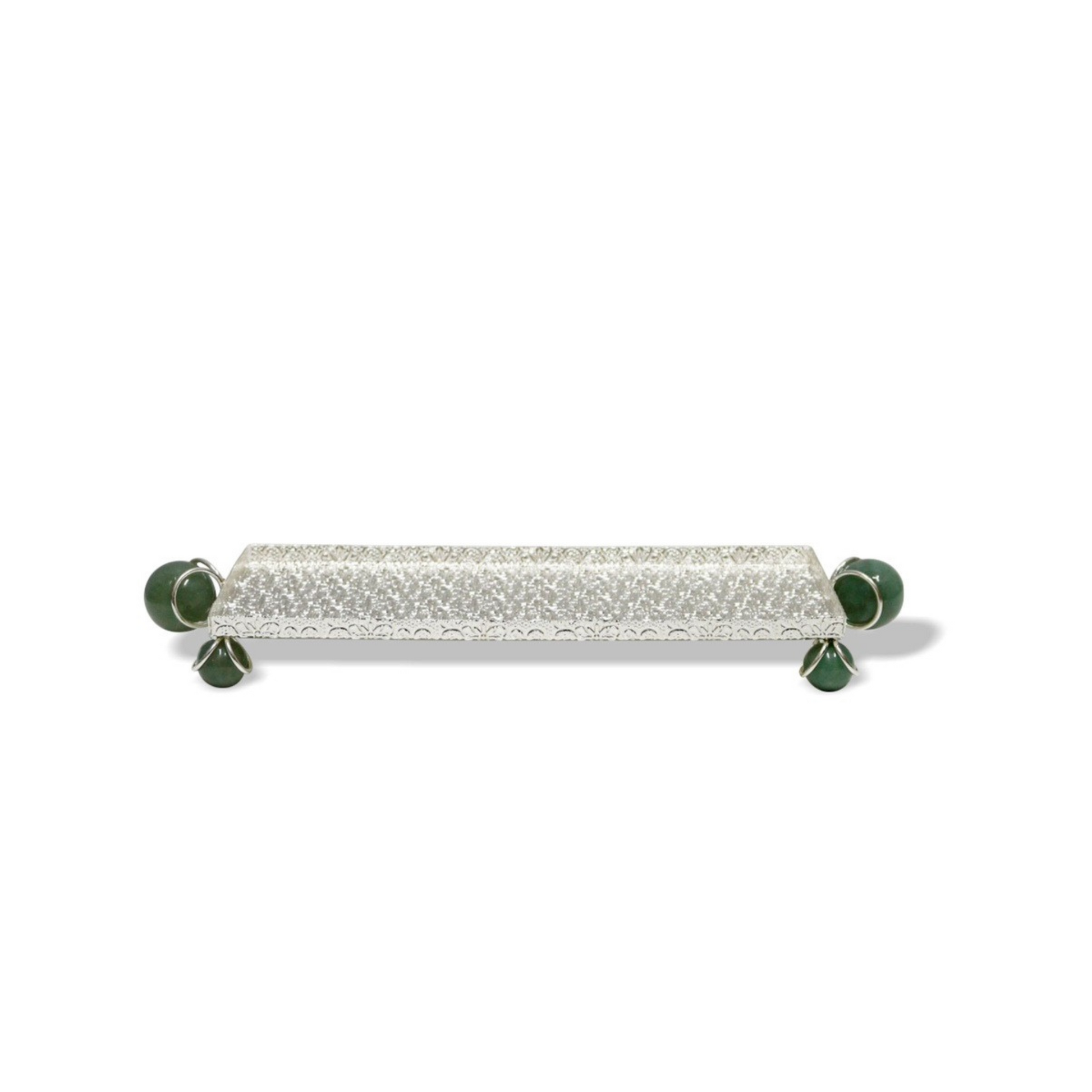 A stylish silver-plated rectangular tray adorned with a striking green stone, perfect for serving or displaying. Its elegant design and vibrant stone accent make it a unique and eye-catching addition to any table or decor.