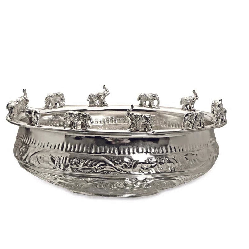 The Elephant Urli is a stunning decorative bowl featuring intricate elephant motifs, symbolizing strength and good fortune. Ideal for adding a traditional charm to your space, it can hold floating flowers, candles, or water to create a serene and auspicious ambiance. Perfect for festive décor or as a captivating centerpiece!